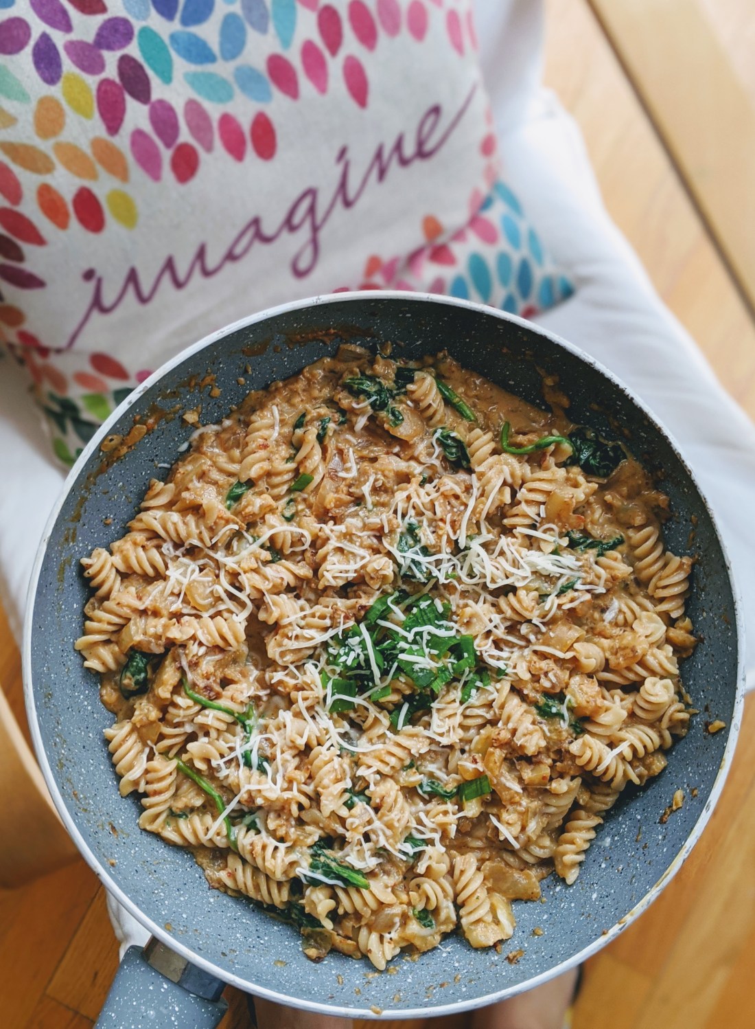 You can basically customize this recipe as you like it. I generally go for generous portions of cauliflower and spinach and reduce Pasta by 4 Oz, making it more rustic and wholesome. Feel free to substitute regular Pasta for red lentil pasta or whole wheat. Ideally Shallots lend a sweeter caramelizing taste to this dish but a regular yellow onion or even a spanish red should be perfect addition. I even add a couple of sprinkles of red chilli flakes to suit my spicier palette.
